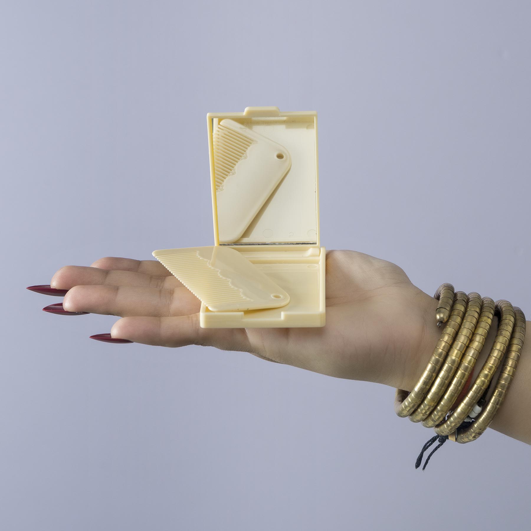 A stylish folding pocket mirror shaped like a chocolate bar, complete with a detachable comb. Perfect for touch-ups anytime, anywhere.