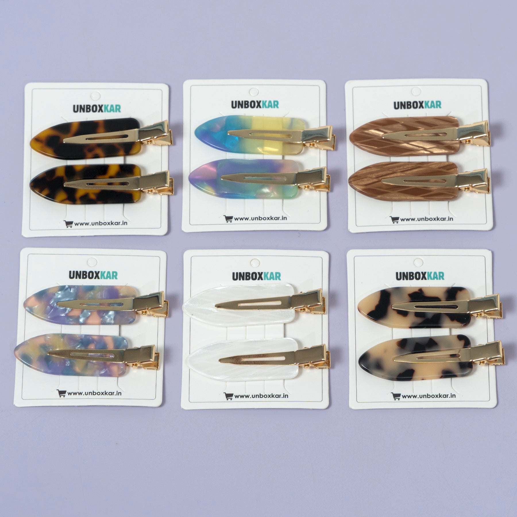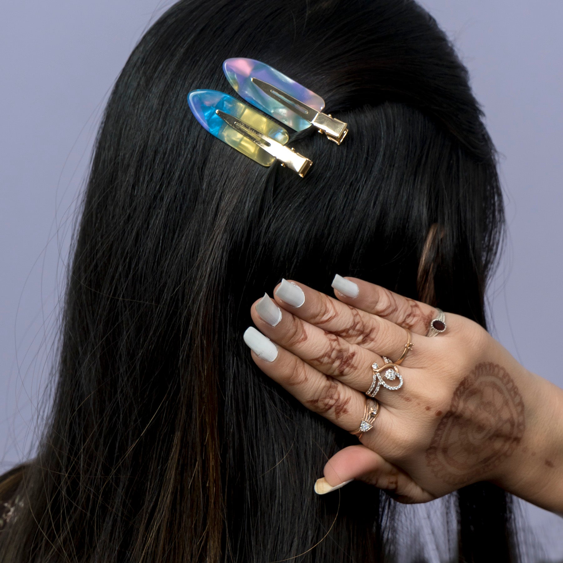A premium set of 2 marble-finish hair clips designed for a chic, modern everyday look. The glossy surface and gold metal grip give your hairstyle a clean and classy finish.