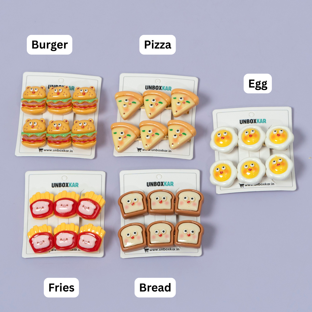 Adorable cartoon-style foodie pins that instantly brighten up any hairstyle. Lightweight, strong grip and perfect for kids & teens. Comes with cute burger, fries, pizza, egg & toast designs.