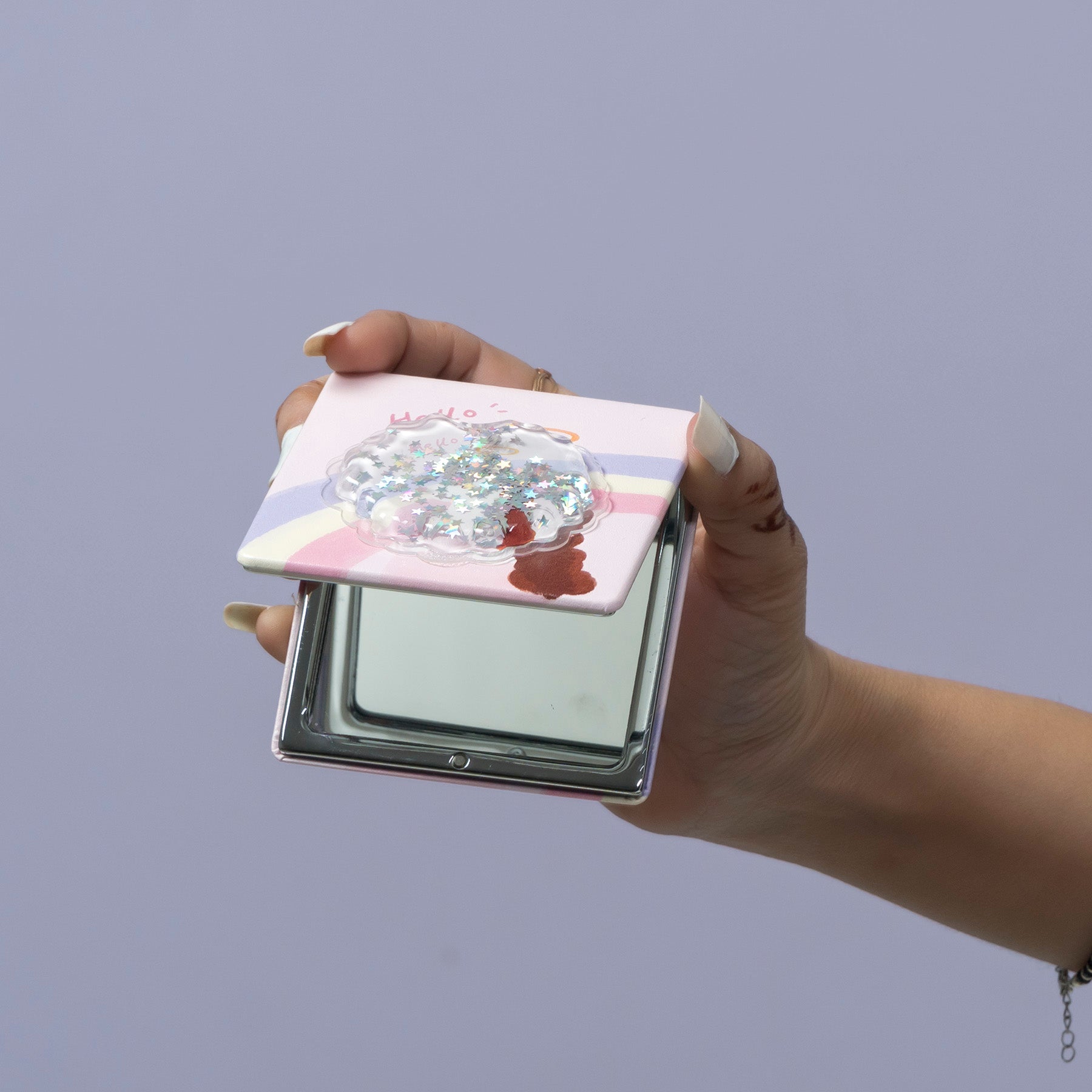 Aesthetic pastel unicorn compact mirror with floating star glitter for a magical touch.