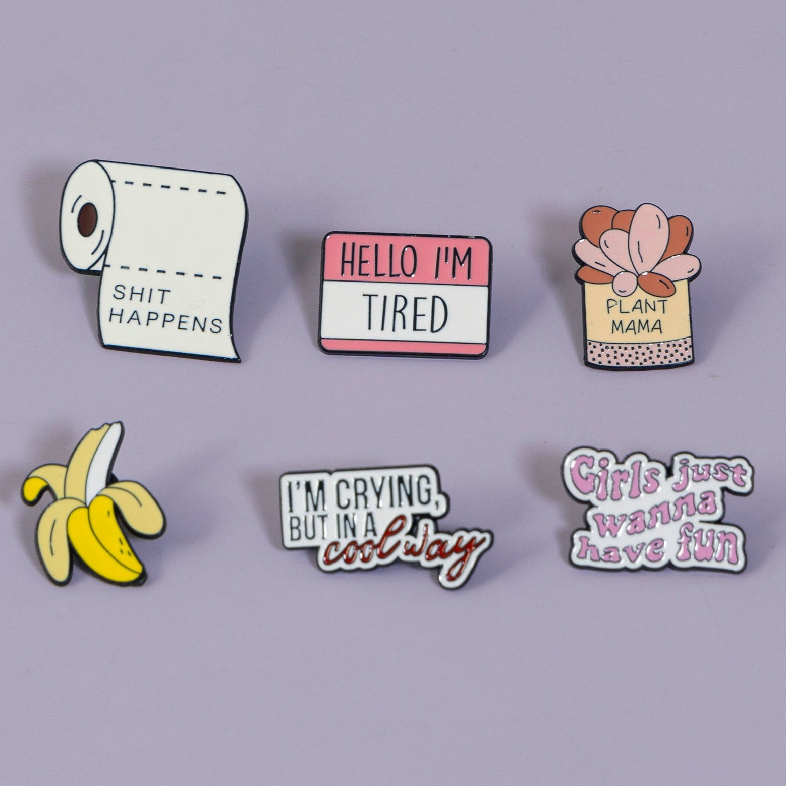 Add personality to your outfit with this playful set of 6 enamel brooches β perfect for jackets, bags, hats, or denim. Each brooch has its own unique design and message, letting you mix and match to match your mood.
