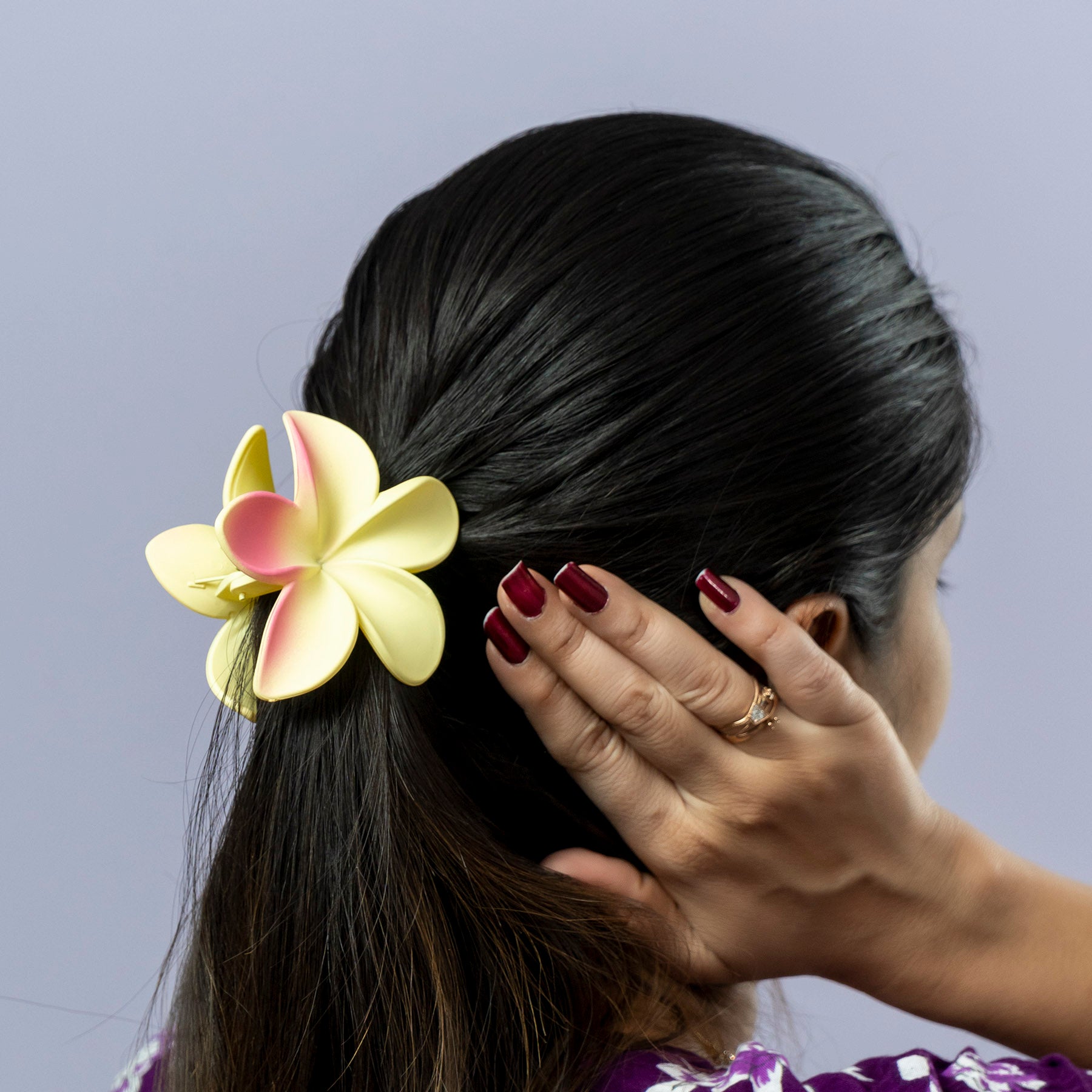A premium matte-finish flower-shaped hair claw with a strong spring grip, suitable for daily wear and all hair types. Minimal, elegant design for neat and stylish hairstyles.