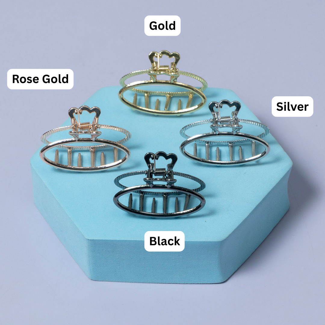 A chic oval metal claw with a cute heart-crown top, perfect for half-tie hairstyles and a clean everyday look. Strong grip, premium metal finish, and available in stunning metallic colours.