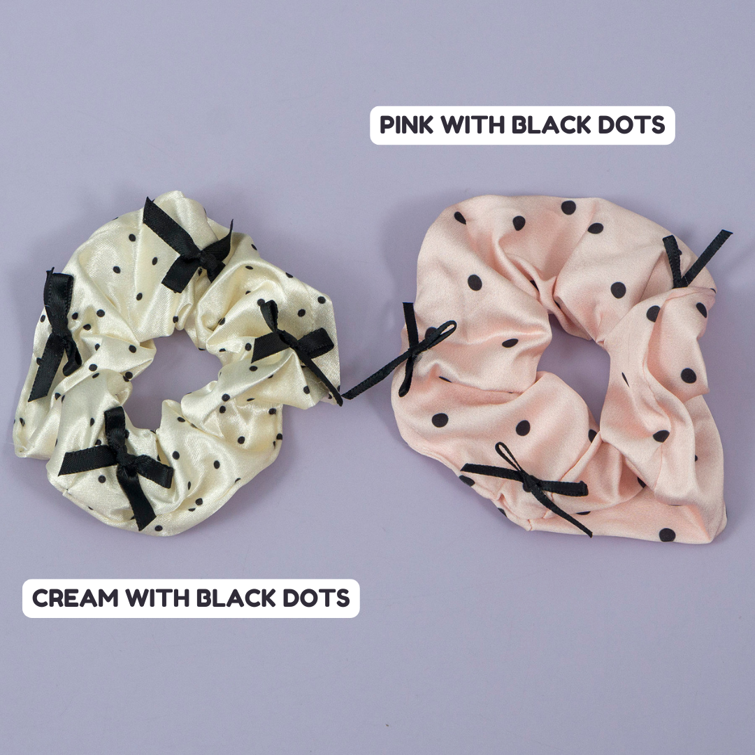 Polka Dot Satin Scrunchie with Black Bows (1 pc) – Stylish satin scrunchie with playful polka dots and chic black bow accents, perfect for adding elegance to everyday looks.
