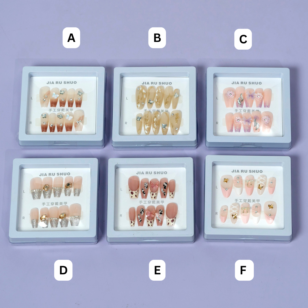 A high-quality designer press-on nail set featuring 10 premium styled nails for an instant salon look.