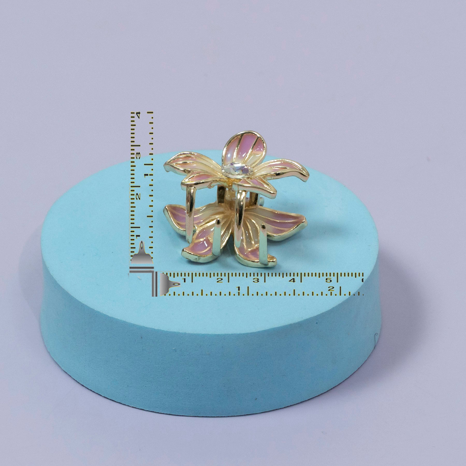 • Design: Layered flower motif with curved enamel petals and central crystal