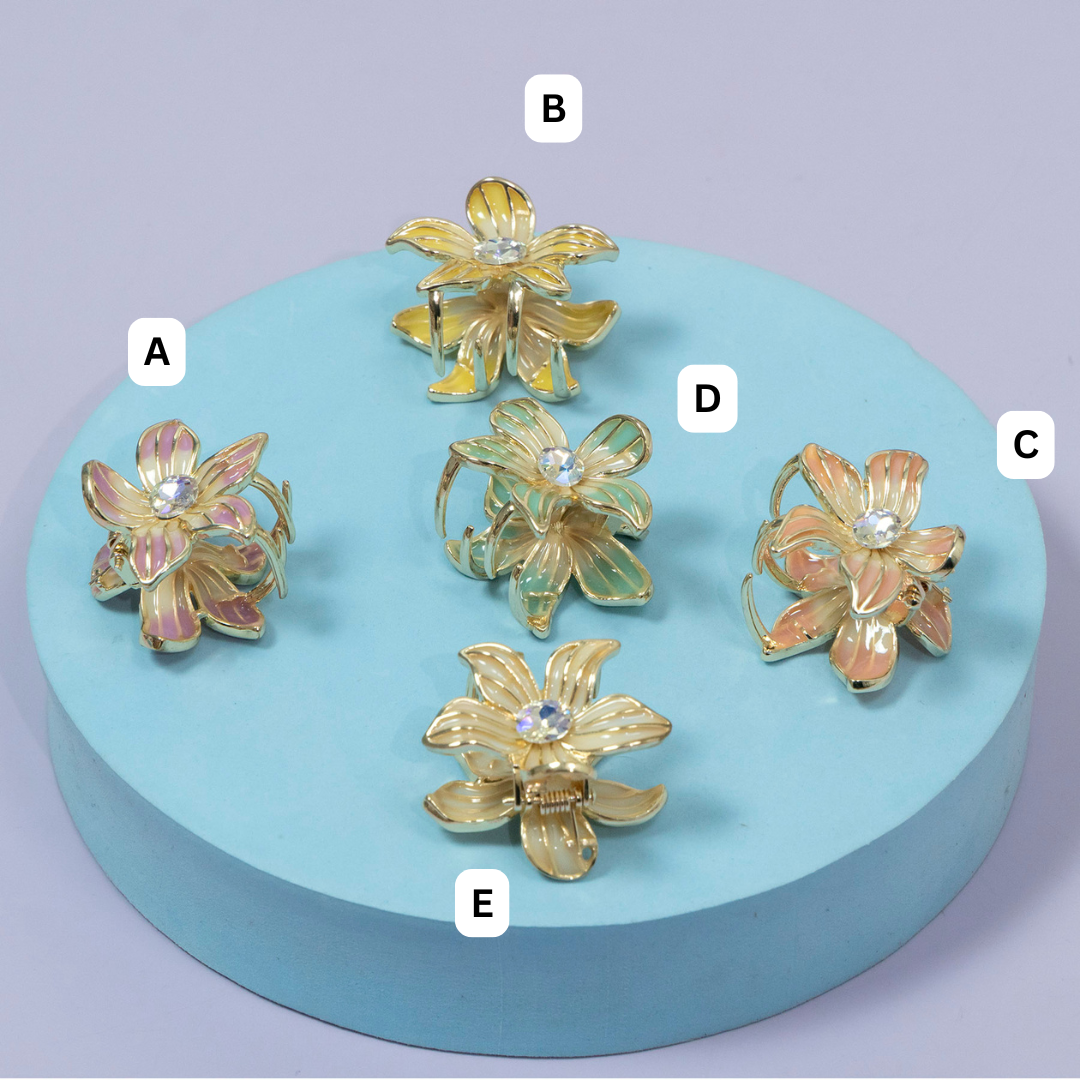 Elegant floral hair claw from ZAYA, crafted in a glossy gold-tone finish with smooth pastel enamel petals and a sparkling crystal center. Designed to elevate everyday hairstyles with a soft, premium look while offering a firm and comfortable grip.