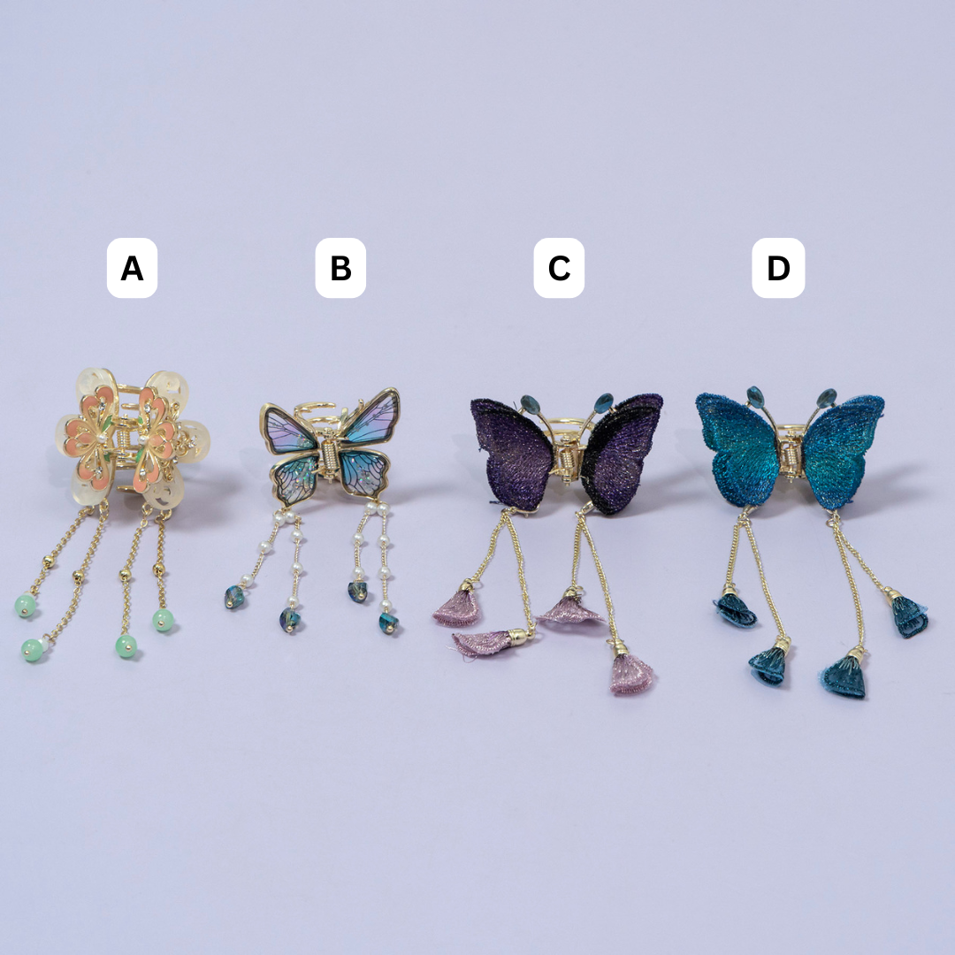 • Design: Butterfly-shaped claw with double tassel drop accents